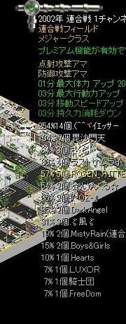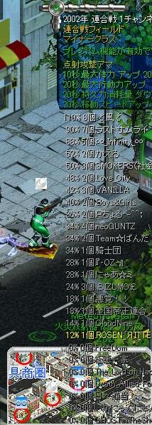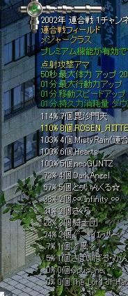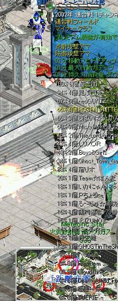 メジャー決勝結果 1.イエッサー 2.毘沙門天 3.さくら 4.ラストサムライ 5.ROSEN RITTER 6.とぅいんくる☆ 7.『-OZ-』 8.DarkAngel 9.ζ風ζ 10.MistyRain 11.Boys&Girls 12.Hearts 13.LUXOR 14.騎士団 15.FreeDom 今回は遠距離57%で遠距離商圏ゲットです。